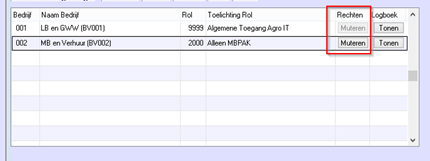 Iedere andere rol die is aangemaakt (in het onderstaande voorbeeld Rol 2000) heeft de button Muteren die u kunt gebruiken om de Mutatie rechten per gebruiker aan te passen.