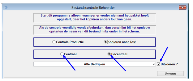 Vervolgens selecteert u Kopiëren naar Test, Decentraal, Alle Bedrijven en plaats een vinkje bij Uitvoeren?, klik daarna op Uitvoeren.