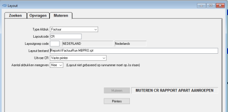Hiermee geeft u aan dat het rapport naar de vooraf vastgelegde printer moet gaan. Vanuit Muteren Afdruk bestanden:Ga naar "Algemeen>Instellingen>Variabele Layout>Muteren Afdruk Bestanden". Indien de printer niet gevonden kan worden, zal de afdruk naar de (Windows)standaard printer gaan. Vanuit Muteren Afdruk Variabele LayoutDit onderdeel wordt met name door MbPakPro gebruikt. Als de printer niet gevonden kan worden, zal de afdruk naar de (Windows) standaard printer gaan. |