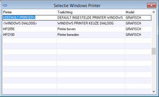 - Eventueel kunt u zelf direct een bepaalde Windows printer toevoegen en kiezen. Daarvoor voert u in het veld Windows Printer letterlijk de naam van de printer in zoals deze ook in het Configuratiescherm in Windows genoemd wordt. Voor overzichten welke altijd op een specifieke printer geprint moeten worden kan het handig zijn om deze printer apart in het selectie scherm te definiëren en via het scherm In te stellen voor dit overzicht toe te wijzen aan dat specifieke overzicht.