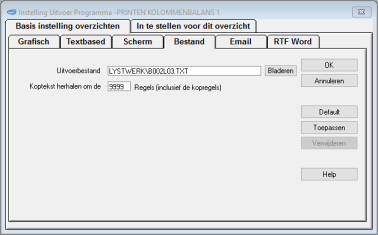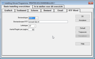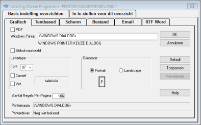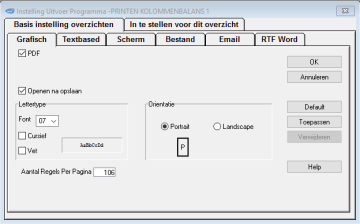 Er zijn verschillende tabbladen met een eigen uitvoer: Grafisch, Textbased, Scherm, Bestand, Email, RTF Word