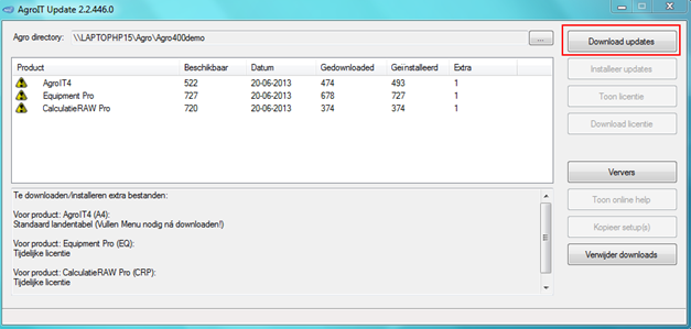 Tevens kunnen voor u klaar gezette updates van andere producten, als Calculatie RAW Pro, Agro Werkplaatagenda of nieuwe licenties (onder Extra) getoond worden