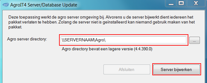De update zal altijd uitgevoerd moeten worden op de server/hoofdcomputer waarop de Agro directory is opgeslagen.